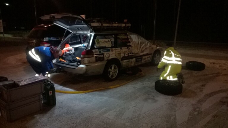 De meeste snelwegkilometers zitten erop en Team Roadrunner bereidt zich voor op sneeuw! In plaats van dansen op de bar, houden Werner Donselaar en Jaap Berends zich nu bezig met een bandenwissel. Zij zullen de rit naar de Noordkaap voortzetten…