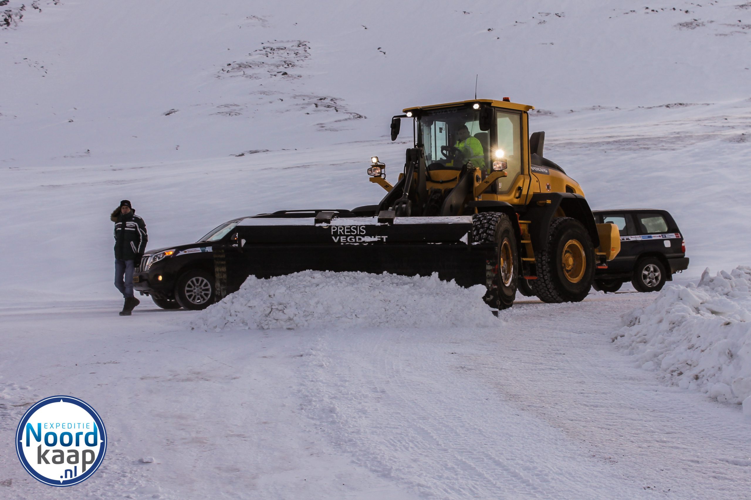 Expeditie Noordkaap gaat naar, jawel, de Noordkaap. Vandaag was het dan zo ver! Het doel bereikt, alle auto’s aangekomen op het noordelijkste stukje van Europa. De teams rijden achter een sneeuwschuiver het laatste stuk, op weg naar de kers op de spreekwoordelijke taart. Daar kunnen ze op de foto met het beroemde monument: de wereldbol. Zo voelt het ook. On top of the world. Een paar stappen verder en je valt er vanaf.