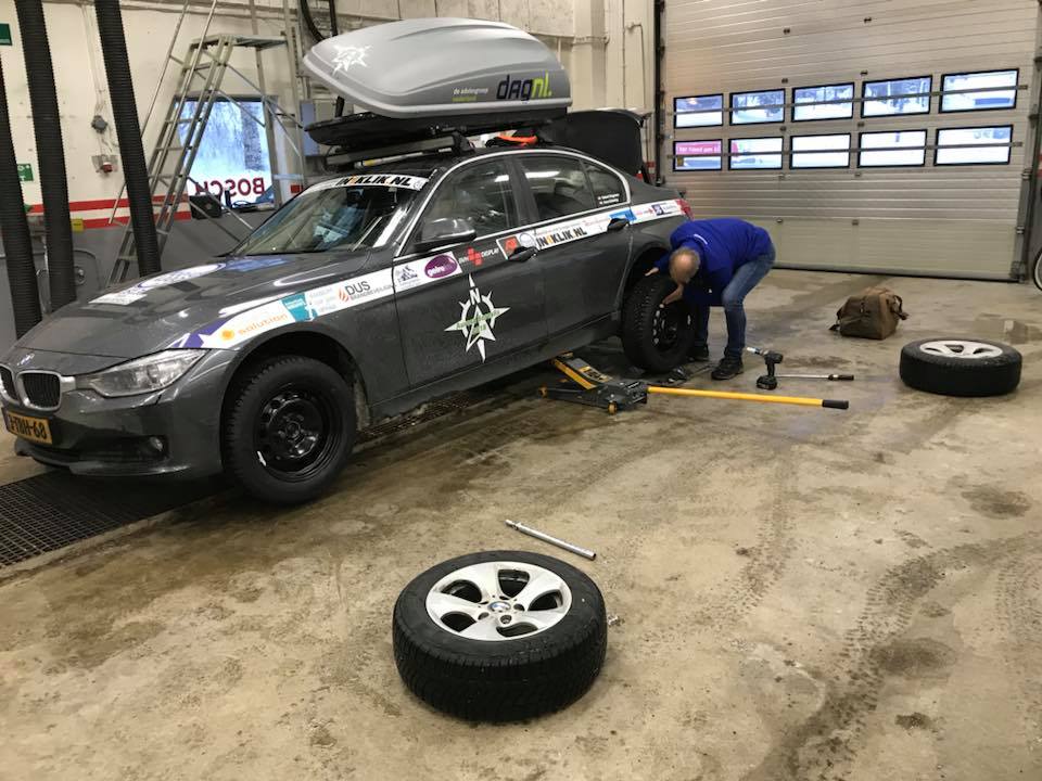 Team 1813 heeft inmiddels de spijkerbanden onder hun auto gelegd. Deze banden met metalen nokken...